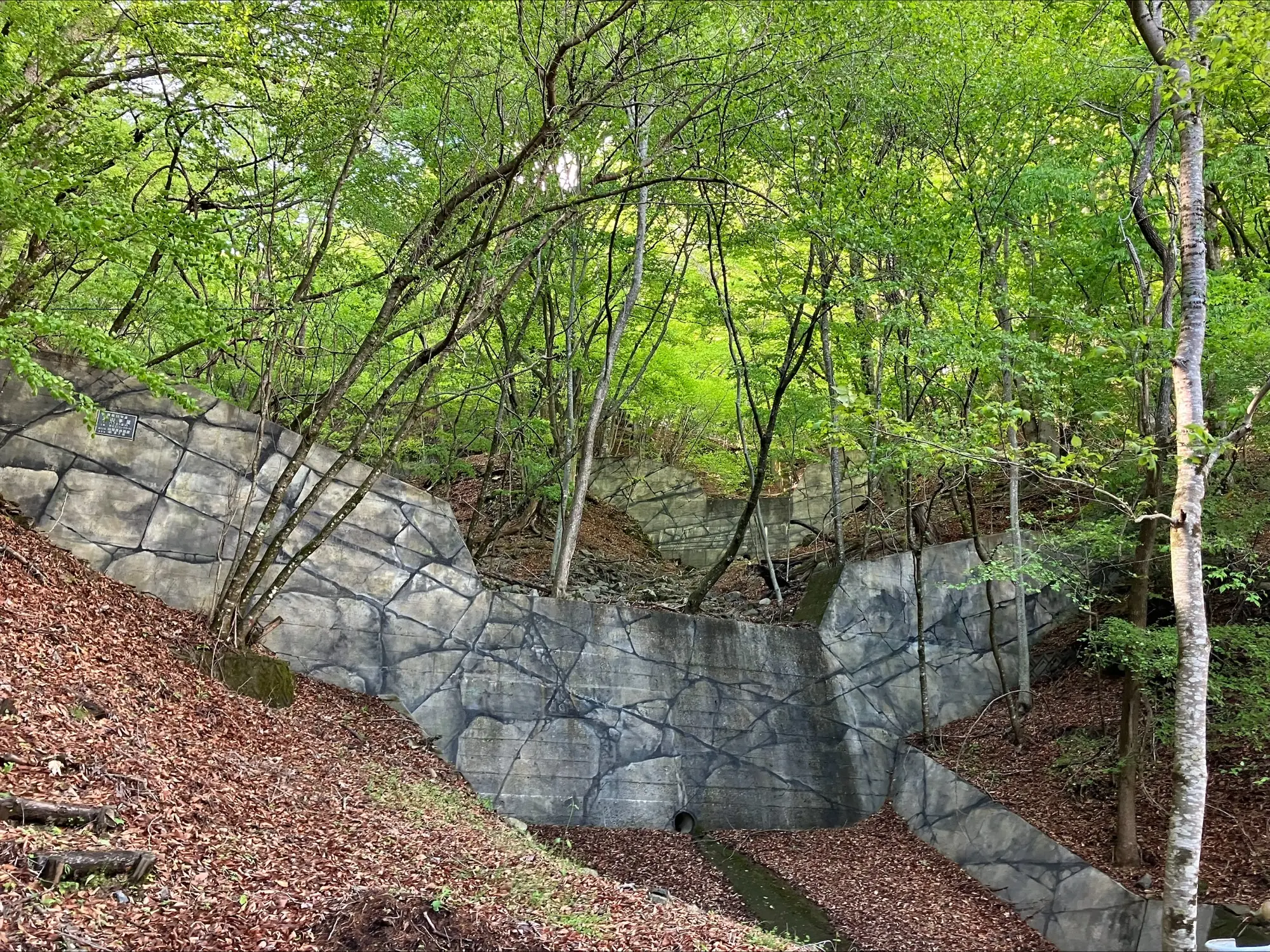 八丁金ヶ窪(写真:1枚目)では、コンクリートによって構築された谷止工が自然な景色に溶け込むように、経年変化で現れる色味を意図的に表現する「エイジング塗装」を施しています。今回の施工では、岩盤風に仕上げられていました。 桜橋(写真:2枚目)では、「エイジング塗装」だけではなくコンクリート表面にモルタルを塗布し、現地周辺の地山(土)のように造作することによって、周辺の景色に溶け込んでいました。