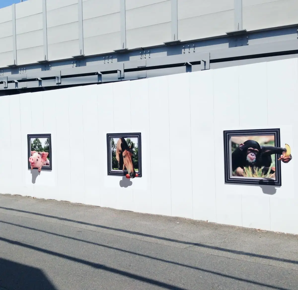 建設現場に設置されている仮囲い(鉄製の白い壁)に貼り付けるだけで、閉鎖的に見られる建設現場のイメージアップが図れます。